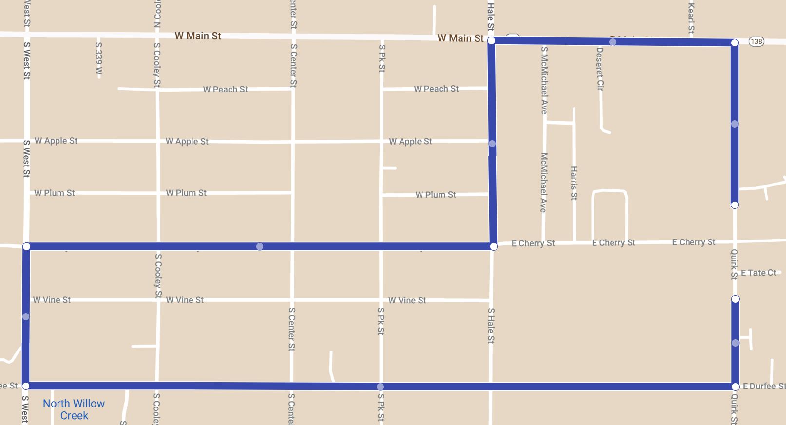 The race will start by the tennis courts and go south on Quirk to Durfee, west on Durfee to West, North on West to Cherry, east on Chery to Hale, north on Hale to Main, east on Main to Quirk and south on Quirk finishing at the High School.